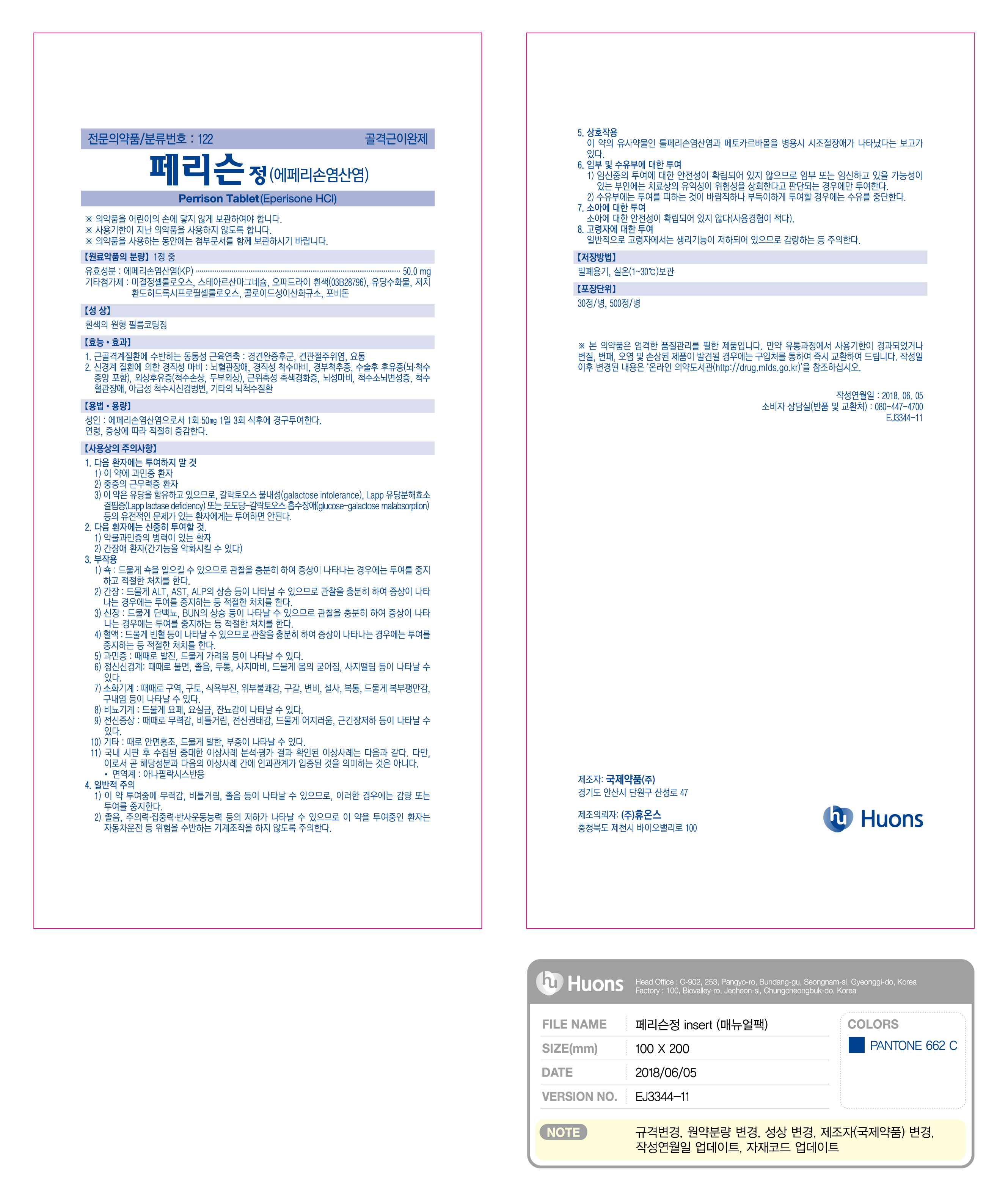 성인 : 염산에페리손으로서 1회 50㎎ 1일 3회 식후에 경구투여한다.